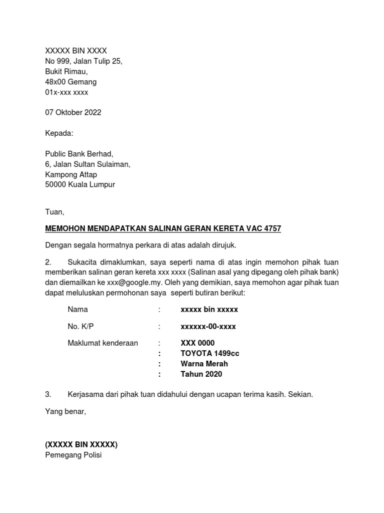 Surat Mohon Salinan Geran Kereta Pdf